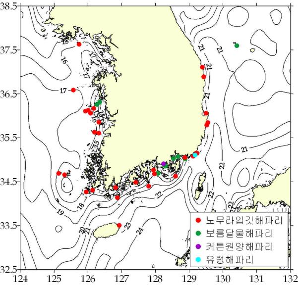 ○ 유령해파리(강독성) - 부산 연근해 1곳에서 출현. •부산 오륙도, 미포 사이 - 수온: 평균 21.00℃ - 출현률: 10/31(0.78%)