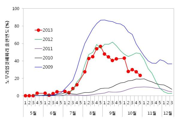 붙임 4. 노무라입깃해파리와 보름달물해파리의 출현빈도 연변동 <노무라입깃해파리><보름달물해파리> |