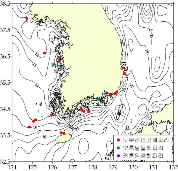 < 주요 상황> ☞ 노무라입깃해파리 : 동․서․남해 해역 출현, 서해 중부 일부해역 밀집출현. ☞ 보름달물해파리 : 동․서․남해 일부해역 출현. ☞ 커튼원양해파리 : 남해 일부해역 출현.