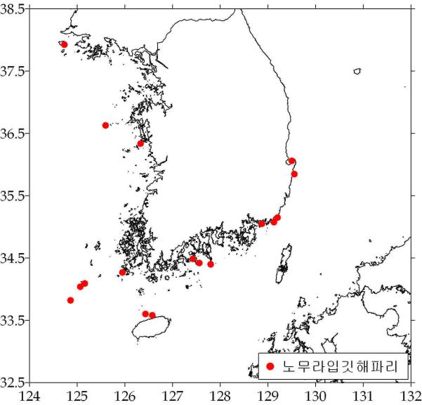 붙임 3. 주요 해파리 분포 주간변동 노무라입깃해파리 보름달물해파리 기타해파리