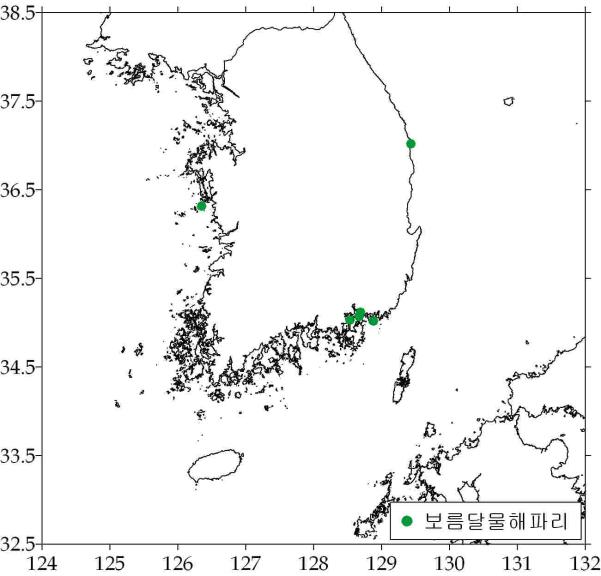 ○ 보름달물해파리(약독성) - 경남 연근해 등 7곳에서 출현. - 수온: 평균 15.49℃(범위: 12.24 ~ 16.80℃) - 출현률: 11/7(7.4%) → 11/14(4.9%) → 11/21(4.9%)