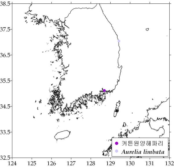 ○ 노무라입깃해파리(강독성) - 전남 연근해 등 10곳에서 출현. - 수온: 평균 14.28℃(범위: 11.68 ~ 18.57℃) - 출현률: 11/14(15.6%) → 11/21(12.5%) → 11/28(7.6%)