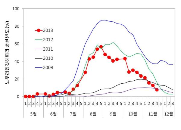 붙임 4. 노무라입깃해파리와 보름달물해파리의 출현빈도 연변동 <노무라입깃해파리><보름달물해파리> |