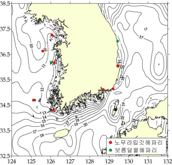 ○ 보름달물해파리(약독성) - 경남 연근해 등 6곳에서 출현. - 수온: 평균 12.82℃(범위: 11.01 ~ 14.81℃) - 출현률: 11/21(4.9%) → 11/28(4.5%) → 12/5(4.3%)