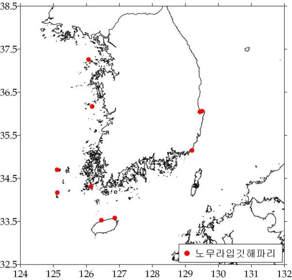 □ 해파리 출현종 및 분포상황 ○ 노무라입깃해파리(강독성) - 전남 연근해 등 8곳에서 출현. - 수온: 평균 11.97℃(범위: 10.54 ~ 13.44℃) - 출현률: 11/21(12.5%) → 11/28(7.6%) → 12/5(5.8%)
