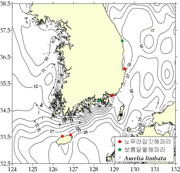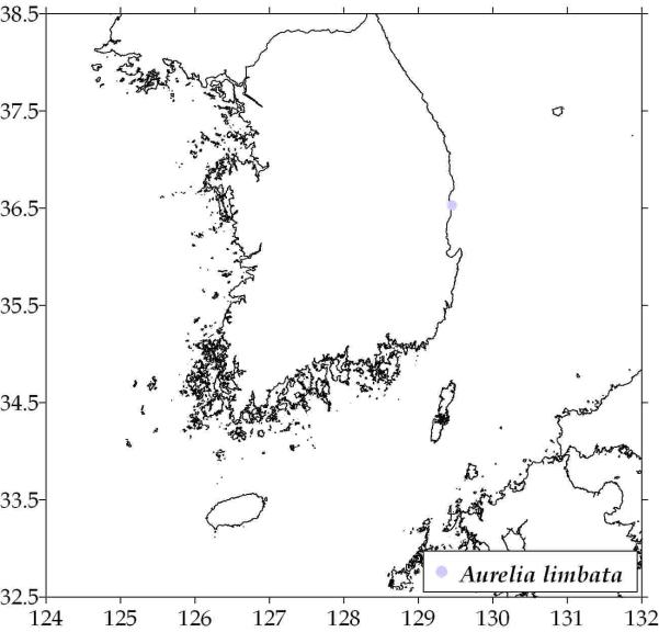 ○ Aurelia limbata(약독성) - 경북 연근해 1곳에서 출현. - 수온: 평균 14.37℃ - 출현률: 12/12(0.71%)