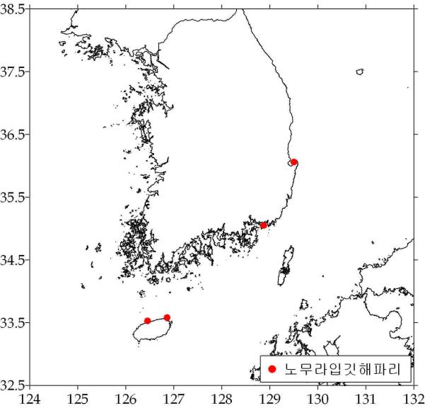 ○ 노무라입깃해파리(강독성) - 제주도 연근해 등 4곳에서 출현. - 수온: 평균 15.43℃(범위: 12.57 ~ 18.34℃) - 출현률: 11/28(7.6%) → 12/5(5.8%) → 12/12(2.8%)