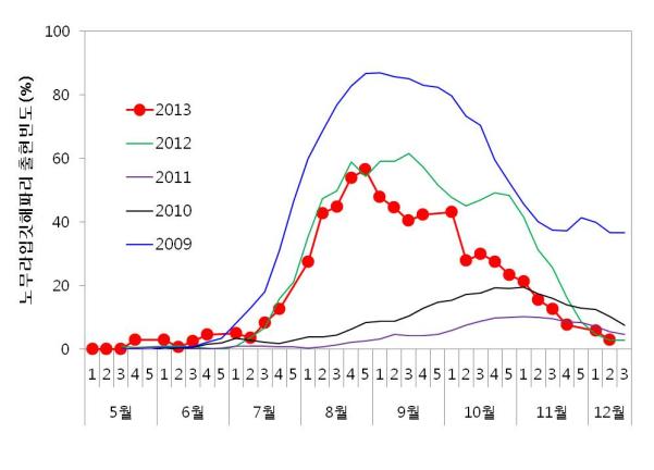붙임 4. 노무라입깃해파리와 보름달물해파리의 출현빈도 연변동 <노무라입깃해파리><보름달물해파리> |