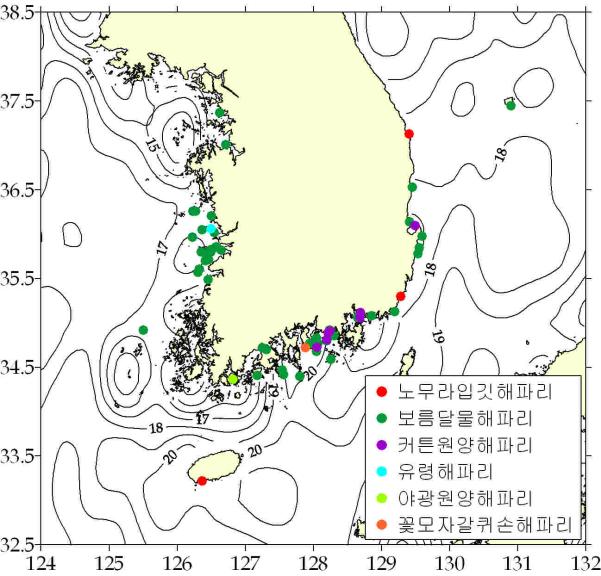 붙임 2. 금주 해파리 분포도 =$row[content]?>그림. 2014년 5월 30일 ~ 6월 5일 한국 연안역 해파리 분포도. 해파리 모니터링요원 및 지자체로부터 취합된 자료임. 등온선은 위성관측 표층수온을 가리킴.