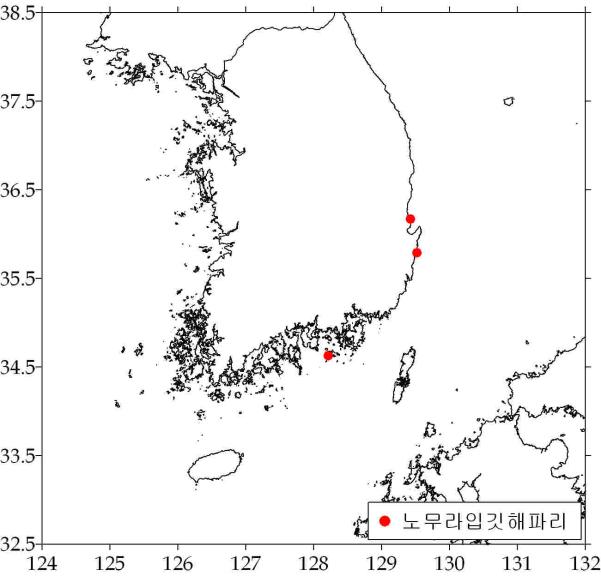 □ 해파리 출현종 및 분포상황 =$row[content]?> ○ 노무라입깃해파리(강독성) - 부산 연근해 등 3곳에서 출현 ‧ 경북 울진 연안에서 소량 출현 ‧ 부산 원전 연안에서 출현 ‧ 제주도 화순 연안에서 출현 - 수온: 평균 13.92℃(범위: 13.64 ~ 14.09℃) - 출현률: 5/22(2.1%) → 5/29(0.72%) → 6/5(2.1%) =$row[content]?>