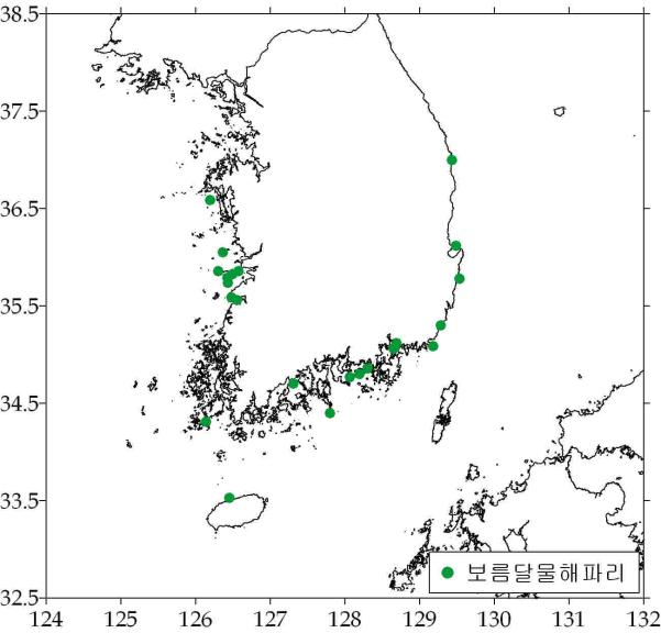 ○ 보름달물해파리(약독성) - 전북 연근해 등 49곳에서 출현 ‧ 경남 진해 잠도/행암만 출현증가 ‧ 전북 군산 전해역 출현증가 ‧ 부산 가덕도 눌차만 출현증가 ‧ 전남 고흥 득량만/거문도 출현증가 - 수온: 평균 14.11℃(범위: 11.74 ~ 17.06℃) - 출현률: 5/22(17.0%) → 5/29(28.1%) → 6/5(34.4%) =$row[content]?>