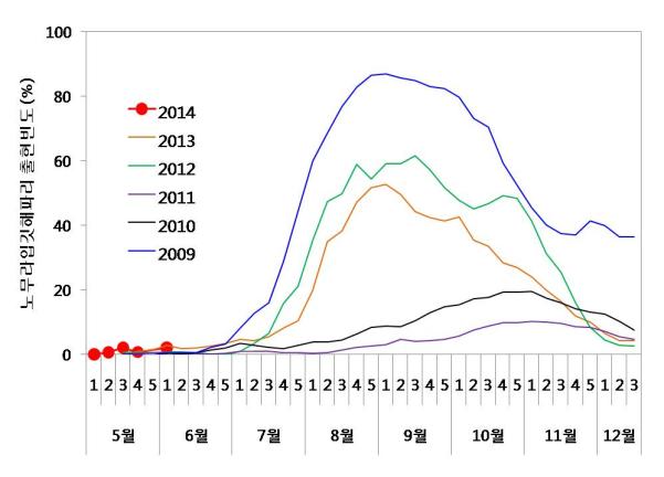 붙임 4. 노무라입깃해파리와 보름달물해파리의 출현빈도 연변동 =$row[content]?><노무라입깃해파리><보름달물해파리> |