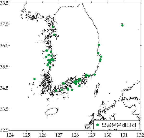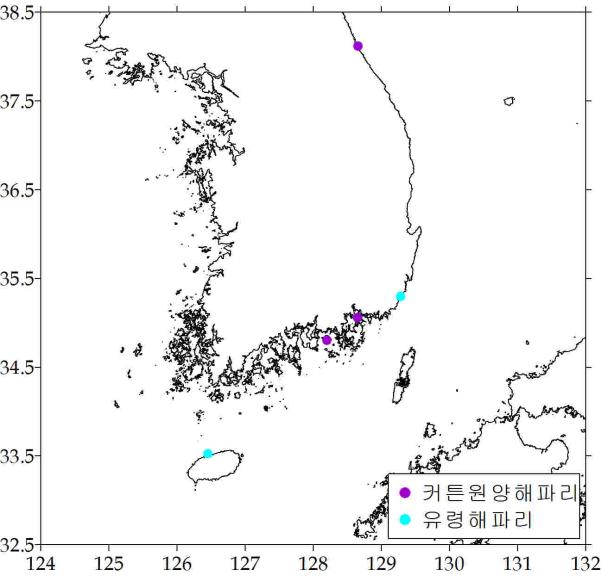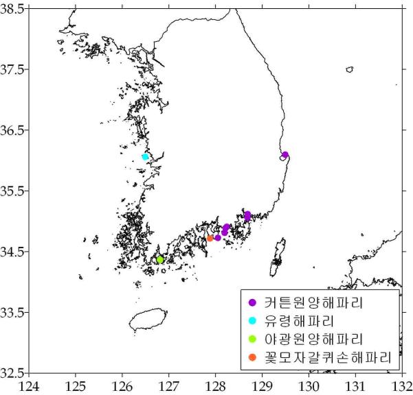 ○ 커튼원양해파리(강독성) - 경남 연근해 등 3곳에서 소량 출현 ‧ 경남 창원/사랑도 연안 소량출현 ‧ 강원도 낙산앞 소량출현 - 수온: 평균 19.03℃(범위: 18.31 ~ 20.06℃) - 출현률: 6/5(4.9%) → 6/12(4.1%) → 6/19(1.9%)