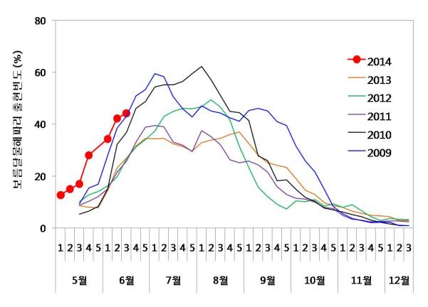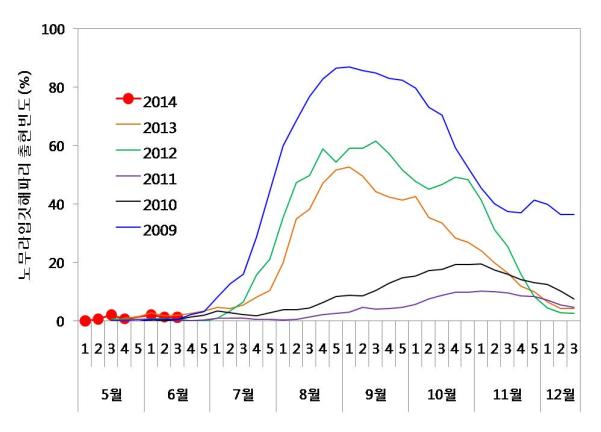 붙임 4. 노무라입깃해파리와 보름달물해파리의 출현빈도 연변동 |