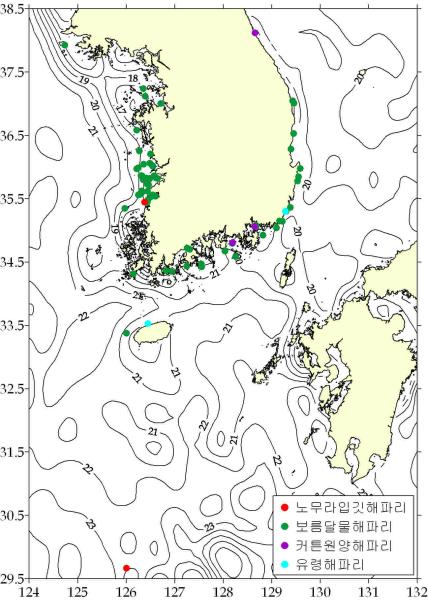 < 주요 상황> ☞ 노무라입깃해파리 : 한․일중간수역, 서해 일부해역 출현. ☞ 보름달물해파리 : 동․서․남해 전해역 출현, 전북, 전남(남) 해역 밀집출현. ☞ 커튼원양해파리 : 동․남해 일부해역 소량 출현. ☞ 유령해파리 : 남해, 제주도 일부해역 소량 출현.
