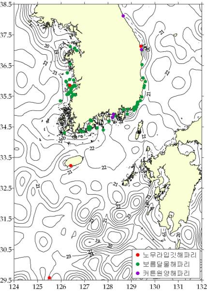 < 주요 상황> ☞ 노무라입깃해파리 : 한․일중간수역, 제주도, 동․서해 일부해역 출현. ☞ 보름달물해파리 : 동․서․남해 전해역 출현, 전북, 전남(남), 부산 해역 밀집출현. ☞ 커튼원양해파리 : 동․남해 일부해역 소량 출현.