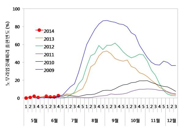 붙임 4. 노무라입깃해파리와 보름달물해파리의 출현빈도 연변동 <노무라입깃해파리><보름달물해파리> |