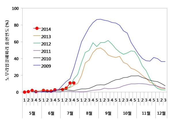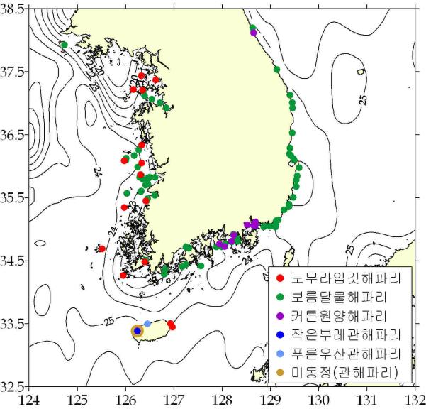 ○ 노무라입깃해파리(강독성) - 제주도 연근해 등 15곳에서 출현 ‧ 전북 군산 어청도/십이동파도/말도/고창 근해에서 소량 출현 ‧ 인천 옹진군/무의도/송도 연안에서 소량 출현 ‧ 충남 삽시도 연안에서 소량 출현 ‧ 전남 안마도/흑산도/진도 연안에서 소량 출현 ‧ 제주도 연안에서 소량 출현 - 수온: 평균 22.74℃(범위: 19.74 ~ 25.06℃) - 출현률: 7/10(4.9%) → 7/17(11.0%) → 7/24(10.9%)