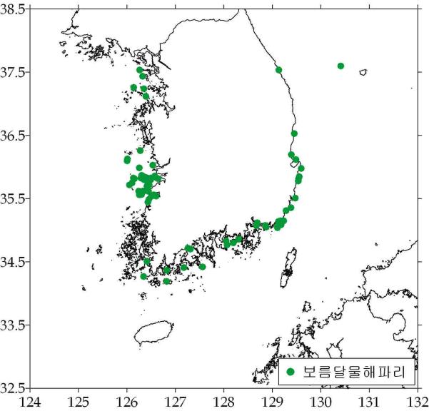 ○ 보름달물해파리(약독성) - 전북 연근해 등 78곳에서 출현 ‧ 전북 군산해역 밀집출현 ‧ 전남 고흥 득량만/신지도/거금도/나로도 밀집출현 ‧ 부산 가덕도/생도/태종대/다대포해역 출현증가 ‧ 경남 창원/남해/사랑도/고성/진해만 밀집출현 ‧ 경북 영덕/포항/울진/감포 밀집출현 ‧ 울산 동구연안 출현증가 - 수온: 평균 22.79℃(범위: 14.28 ~ 25.06℃) - 출현률: 7/10(54.2%) → 7/17(52.9%) → 7/24(55.5%)