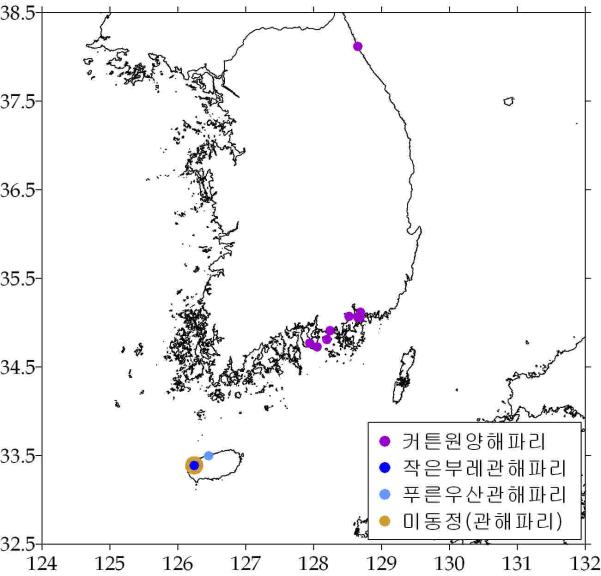○ 작은부레관해파리(맹독성) - 제주도 연근해 1곳에서 출현 - 수온: 평균 22.03℃
