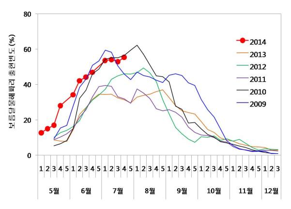 붙임 4. 노무라입깃해파리와 보름달물해파리의 출현빈도 연변동 <노무라입깃해파리><보름달물해파리> |