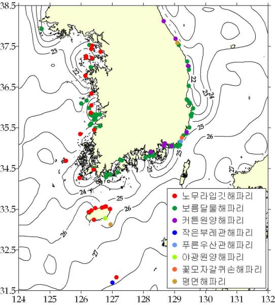 ○ 평면해파리(약독성) - 제주도 연근해 등 2곳에서 소량출현 - 수온: 평균 23.90℃(범위: 21.63 ~ 26.16℃)