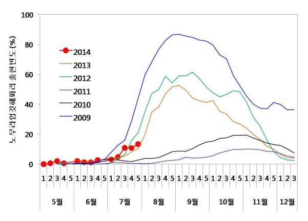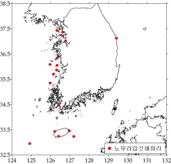 ○ 노무라입깃해파리(강독성) - 제주도 연근해 등 24곳에서 출현 ‧ 전북 군산 십이동파도/말도/고창 근해에서 소량 출현 ‧ 인천 옹진군/무의도/송도/덕적도 연안에서 소량 출현 ‧ 충남 삽시도/모항 연안에서 소량 출현 ‧ 전남 안마도/흑산도/진도 연안에서 소량 출현 ‧ 제주도 연안에서 출현 - 수온: 평균 23.17℃(범위: 18.83 ~ 27.88℃) - 출현률: 7/17(11.0%) → 7/24(10.9%) → 7/31(13.5%)