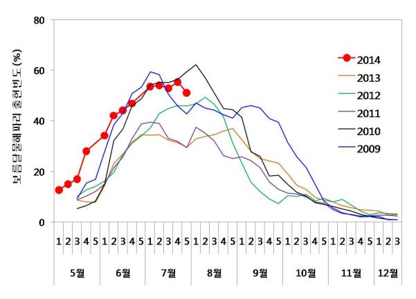 붙임 4. 노무라입깃해파리와 보름달물해파리의 출현빈도 연변동 <노무라입깃해파리><보름달물해파리> |