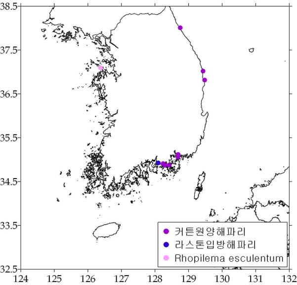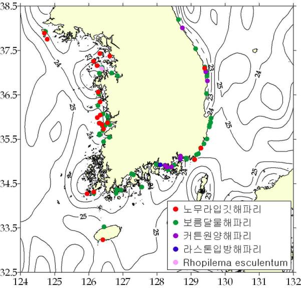 ○ 라스톤입방해파리(맹독성) - 경남 사천 남일대해수욕장에서 출현 - 수온: 평균 23.09℃