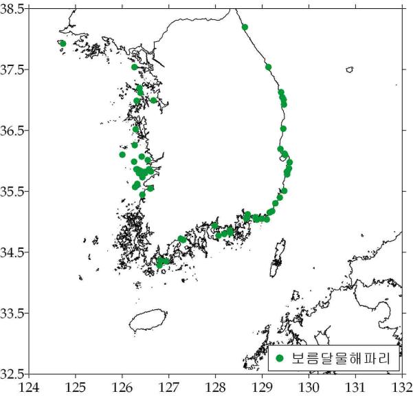 ○ 보름달물해파리(약독성) - 전북 연근해 등 62곳에서 출현 ‧ 전북 새만금/고군산군도/말도/방축도/고창 연안 밀집출현 ‧ 전남 득량만/완도 연안 밀집출현 ‧ 부산 가덕도 연안 밀집출현 ‧ 경남 창원 잠도/행암만/고성/진해만 연안 밀집출현 ‧ 경북 감포/구룡포항/울진 연안 밀집출현 - 수온: 평균 23.63℃(범위: 20.20 ~ 27.27℃) - 출현률: 7/31(51.1%) → 8/7(50.4%) → 8/14(44.2%)