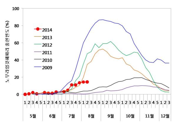 ○ 노무라입깃해파리(강독성) - 인천 연근해 등 20곳에서 출현 ‧ 인천 송도/소청도/이작도/덕적도/백령도 /무의도 연안 소량 출현 ‧ 충남 태안반도/삽시도 연안 소량 출현 ‧ 전북 군산 비안도도/선유도/새만금 근해 소량 출현 ‧ 전남 진도 연안 소량 출현 ‧ 부산 고리/생도 연안 소량 출현 ‧ 경북 울진 연안 소량 출현 ‧ 제주도 연안 소량 출현 - 수온: 평균 23.07℃(범위: 20.24 ~ 25.66℃) - 출현률: 7/31(13.5%) → 8/7(14.4%) → 8/14(14.5%)