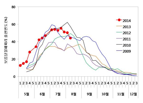 붙임 4. 노무라입깃해파리와 보름달물해파리의 출현빈도 연변동 <노무라입깃해파리><보름달물해파리> |