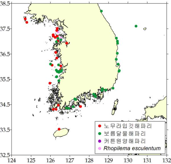 붙임 3. 주요 해파리 분포 주간변동 노무라입깃해파리 보름달물해파리 기타해파리