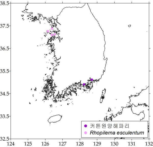 ○ Rhopilema esculentum(약독성) - 인천 연근해 4곳에서 소량출현 ‧ 인천 무의도/덕적도 연안 소량출현 ‧ 경기도 안산시 풍도/입파도 연안 소량출현 - 출현률: 8/14(0.72%) → 8/21(1.5%) → 8/28(2.8%)
