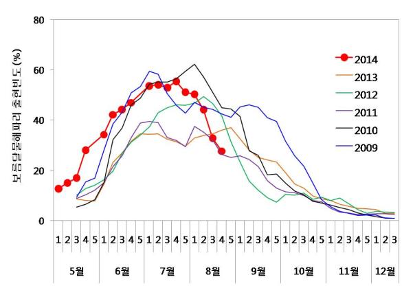 붙임 4. 노무라입깃해파리와 보름달물해파리의 출현빈도 연변동 <노무라입깃해파리><보름달물해파리> |