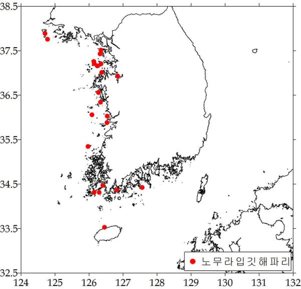 □ 해파리 출현종 및 분포상황 ○ 노무라입깃해파리(강독성) - 인천 연근해 등 31곳에서 출현 ‧ 인천 연평도/이작도/덕적도/장봉도/백령도 /동수도 연안 소량 출현 ‧ 경기도 평택항/입파도/시흥 연안 소량 출현 ‧ 충남 태안반도/대산항/삽시도 연안 소량 출현 ‧ 전북 군산 새만금 바깥해역 소량 출현 ‧ 전남 진도/완도/나로도/소리도 연안 소량 출현 ‧ 울산 연안 소량 출현 ‧ 경북 양포만 소량 출현 ‧ 제주도 연안 소량 출현 - 수온: 평균 23.18℃(범위: 19.99 ~ 26.04℃) - 출현률: 8/21(17.9%) → 8/28(15.6%) → 9/4(18.1%)
