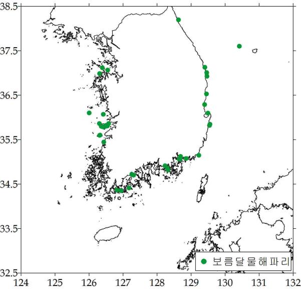 ○ 보름달물해파리(약독성) - 경남 연근해 등 45곳에서 출현 ‧ 전북 새만금/위도/신지도 연안 밀집출현 ‧ 전남 거금도 연안 밀집출현 ‧ 경남 창원 잠도/사랑도 연안 밀집출현 ‧ 부산 태종대/영도 연안 밀집출현 ‧ 경북 감포 연안 밀집출현 - 수온: 평균 23.16℃(범위: 20.37 ~ 26.13℃) - 출현률: 8/21(32.8%) → 8/28(27.7%) → 9/4(26.5%)