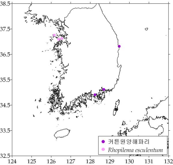 ○ 커튼원양해파리(강독성) - 경남 연근해 등 3곳에서 출현 ‧ 경남 고성/행암만 연안 소량출현 ‧ 경북 울진 연안 소량출현 - 수온: 평균 22.83℃(범위: 21.91 ~ 23.97℃) - 출현률: 8/21(3.0%) → 8/28(1.4%) → 9/4(1.8%)