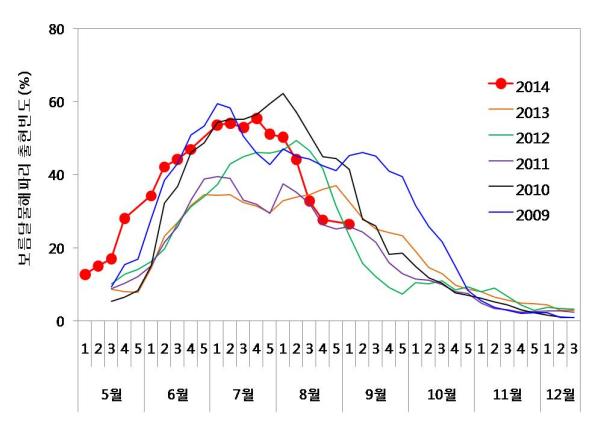 붙임 4. 노무라입깃해파리와 보름달물해파리의 출현빈도 연변동 <노무라입깃해파리><보름달물해파리> |
