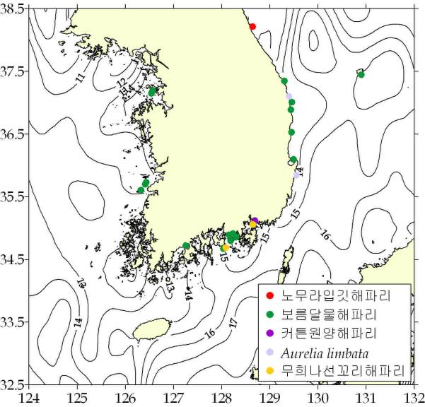 < 주요 상황> ☞ 노무라입깃해파리 : 동해 일부해역 소량 출현. ☞ 보름달물해파리 : 동․서․남해 일부해역 소량 출현. ☞ 커튼원양해파리 : 남해 일부해역 소량 출현. ☞ 무희나선꼬리해파리 : 남해 일부해역 소량 출현. ☞ Aurelia limbata : 동해 일부해역 소량 출현.