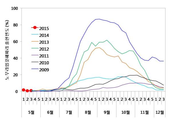 붙임 4. 노무라입깃해파리와 보름달물해파리의 출현빈도 연변동 ※ 예년자료는 3점 이동평균치로서 5월초의 자료는 나타나지 않음 <노무라입깃해파리><보름달물해파리> |