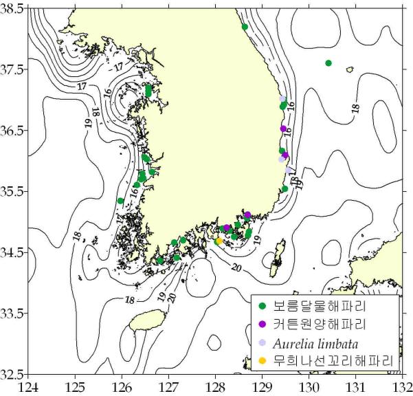 < 주요 상황> ☞ 보름달물해파리 : 동․서․남해 일부해역 출현, 전북/전남/경남 일부해역 출현증가 ☞ 커튼원양해파리 : 동․남해 일부해역 소량 출현. ☞ 무희나선꼬리해파리 : 남해 일부해역 소량 출현. ☞ Aurelia limbata : 동해 일부해역 소량 출현.