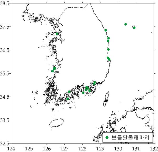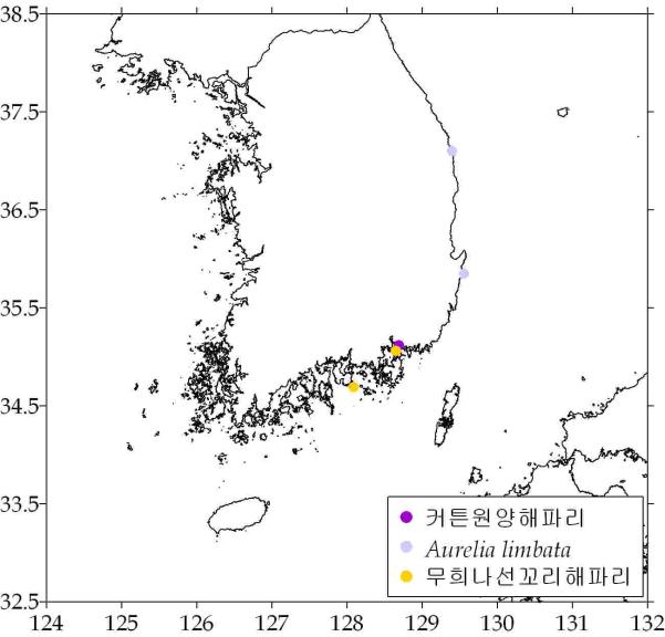 ○ Aurelia limbata(약독성) - 경북 연근해 3곳, 소량 출현 ‧ 경북 감포/울진/영일만 연안 - 수온: 평균 15.59℃(범위: 13.43 ~ 17.12℃) - 출현률: 5/21(1.6%) → 5/28(1.6%) → 6/4(2.4%)