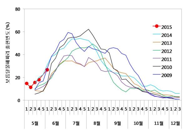 붙임 4. 노무라입깃해파리와 보름달물해파리의 출현빈도 연변동 ※ 예년자료는 3점 이동평균치로서 5월초의 자료는 나타나지 않음 <노무라입깃해파리><보름달물해파리> |