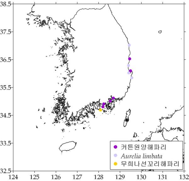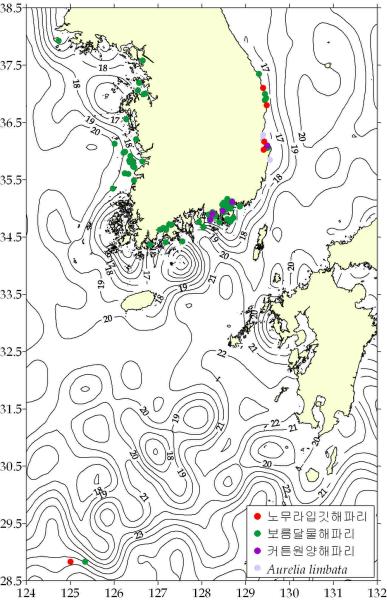 < 주요 상황> ☞ 노무라입깃해파리 : 동해/동중국해 일부해역 출현. ☞ 보름달물해파리 : 동․서․남해 일부해역 출현, 전북/전남/경남 일부해역 밀집출현. ☞ 커튼원양해파리 : 동․남해 일부해역 소량 출현. ☞ Aurelia limbata : 동해 일부해역 소량 출현.