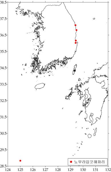 ○ 노무라입깃해파리(강독성) - 경북 연근해 등 5곳 출현 ‧ 경북 포항시 영일만/흥해, 울진원자력발전소 /오천항 연안 출현 ‧ 동중국해 밀집출현 - 수온: 평균 17.40℃(범위: 12.32 ~ 24.91℃) - 출현률: 6/11(0.73%) → 6/18(3.7%)