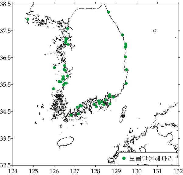 ○ 보름달물해파리(약독성) - 경남 연근해 등 69곳 출현, 전북/전남/경남 일부해역 밀집출현 ‧ 인천 백령도/강화도 연안 소량출현 ‧ 경기 행낙곡/국화도 연안 소량출현 ‧ 충남 보령시 황죽도/당진군/태안반도 연안 소량출현 ‧ 전북 비안도/무녀도/새만금/위도/고창/ 십이동파도/장자도/선유도/방축도 연안 밀집출현 ‧ 전남 안마도/득량만/거금도/신지도 연안 밀집출현 ‧ 경남 창원/잠도/고성/행암만/사랑도/미조 /통영 가조도/거제 지세포 연안 밀집출현 ‧ 부산 가덕도 연안 소량출현 ‧ 경북 북구 월포/오천항 연안 출현 증가 ‧ 강원도 삼척 연안 소량출현 - 수온: 평균 17.36℃(범위: 14.18 ~ 22.32℃) - 출현률: 6/4(26.8%) → 6/11(36.5%) → 6/18(33.1%)