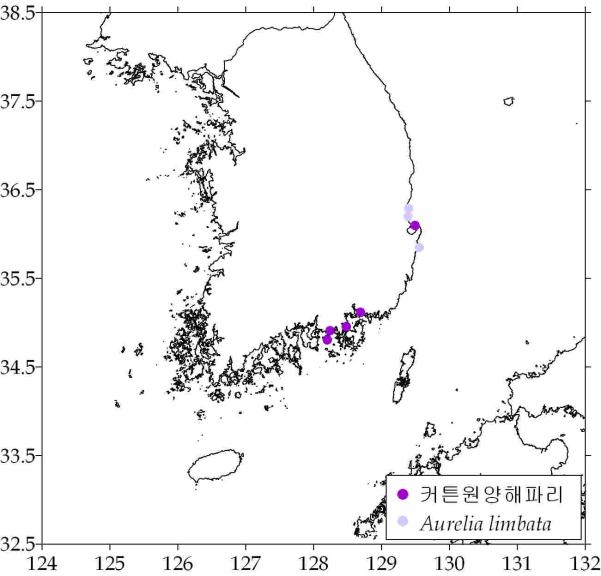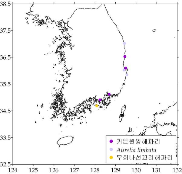 ○ Aurelia limbata(약독성) - 경북 연근해 3곳, 소량 출현 ‧ 경북 감포/영덕/포항 연안 - 수온: 평균 15.63℃(범위: 15.09 ~ 16.41℃) - 출현률: 6/4(2.4%) → 6/11(2.9%) → 6/18(2.3%)