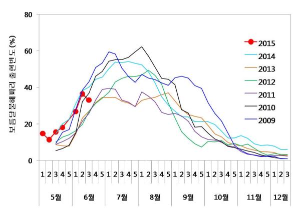 붙임 4. 노무라입깃해파리와 보름달물해파리의 출현빈도 연변동 ※ 예년자료는 3점 이동평균치로서 5월초의 자료는 나타나지 않음 <노무라입깃해파리><보름달물해파리> |