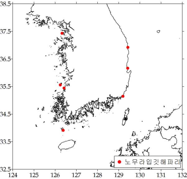 □ 해파리 출현종 및 분포상황 ○ 노무라입깃해파리(강독성) - 전북 연근해 등 7곳, 소량 출현 ‧ 인천 무의도 연안 출현 ‧ 전북 고창 자룡리/위도 연안 출현 ‧ 부산 기장 동수 연안 출현 ‧ 경북 포항/울진 연안 출현 ‧ 제주도 추자도 연안 출현 - 출현률: 7/9(7.9%) → 7/16(6.7%) → 7/23(6.1%)